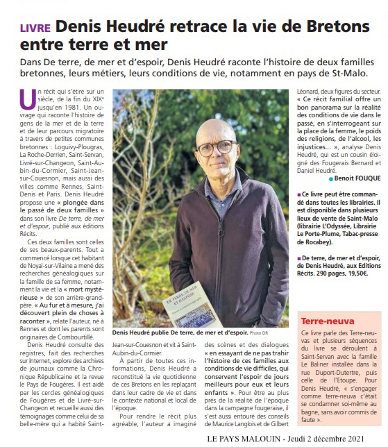 L’ouvrage de Denis Heudré nous amène à suivre l’histoire de gens de la mer et de la terre et leur parcours migratoire à travers de petites communes bretonnes : Loguivy-Plougras, La Roche-Derrien, Saint-Servan, Livré-sur-Changeon, St Aubin-du-Cormier, Saint-Jean-sur-Couesnon ; mais aussi des villes comme Rennes, Saint-Denis et Paris.